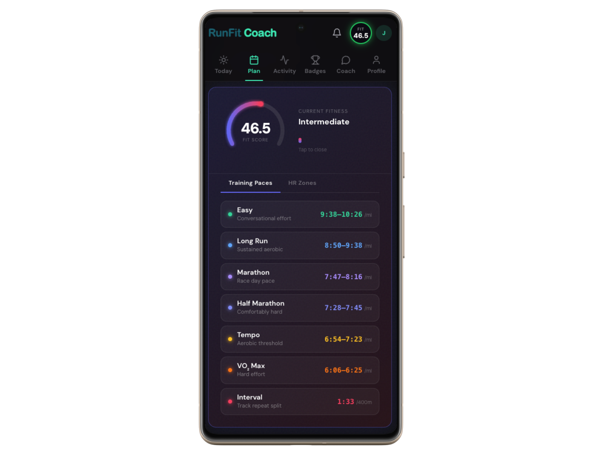 Enter a recent race result. RunFitCoach calculates your FIT Score and sets five personalized pace zones: easy, tempo, interval, marathon, half marathon. Race again and the whole plan recalibrates.