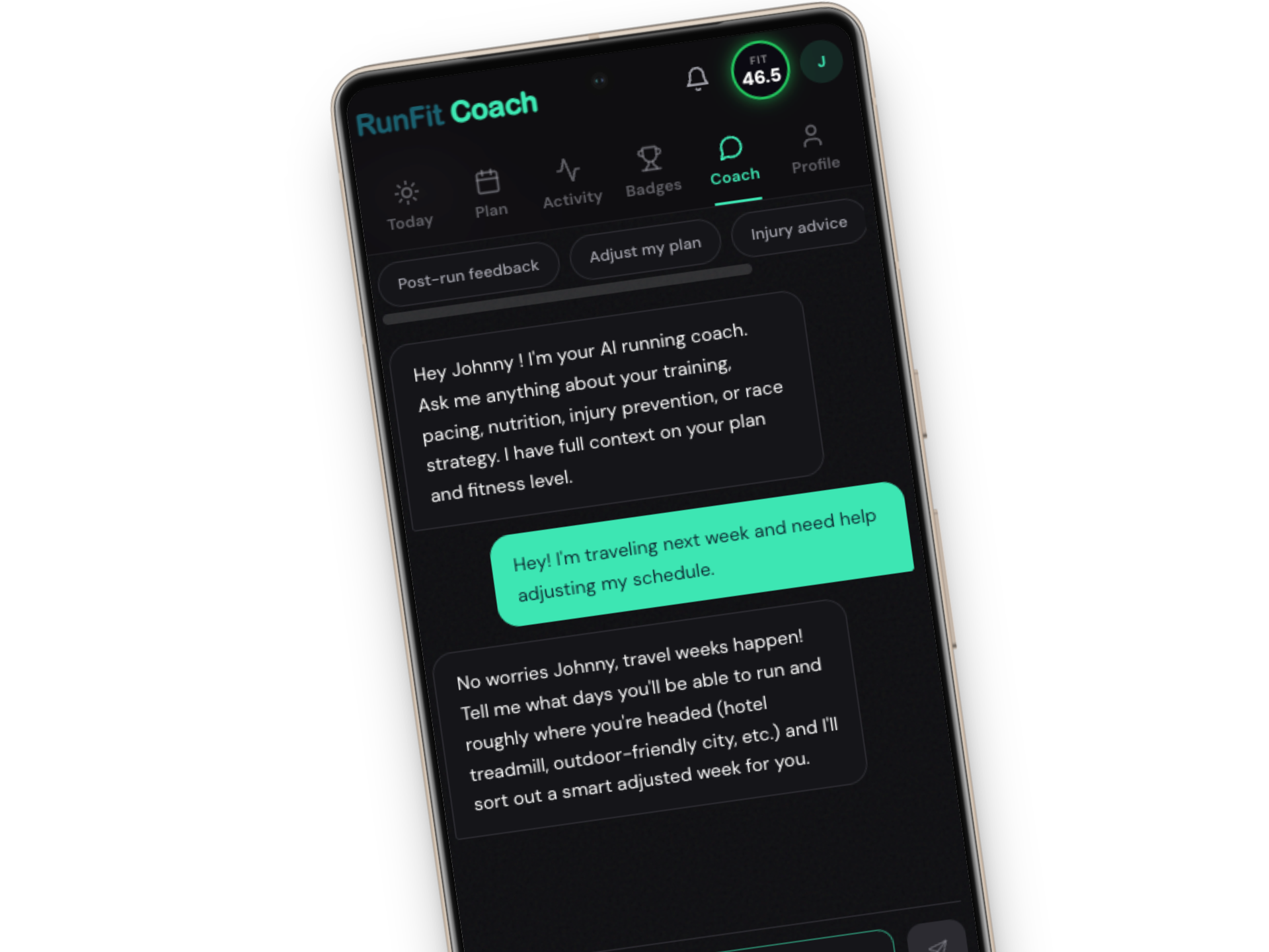 Got sick? Traveling? Raced unexpectedly? Adjust any week with a simple prompt. Full plan history with undo means nothing is ever lost. Your training adapts to your life.